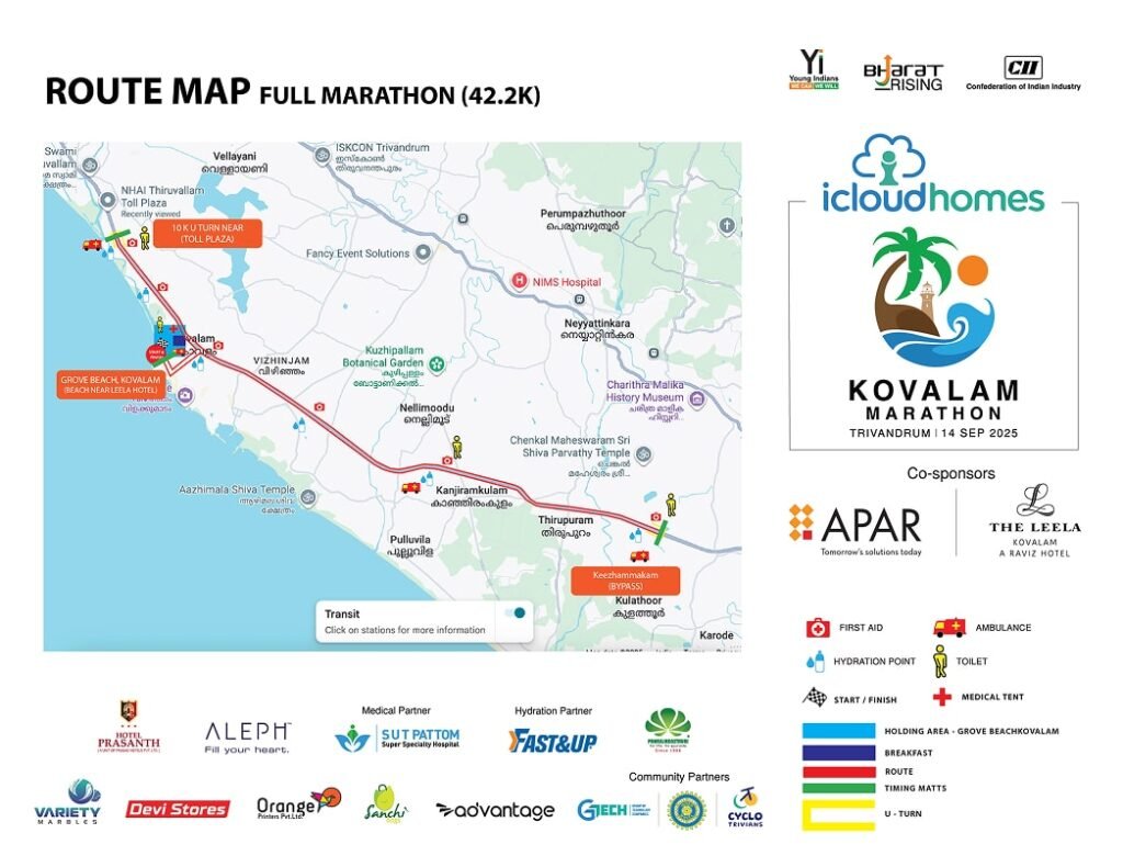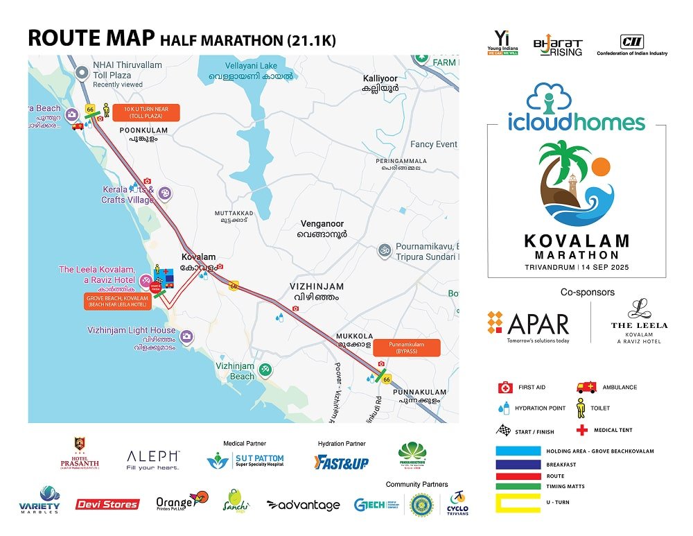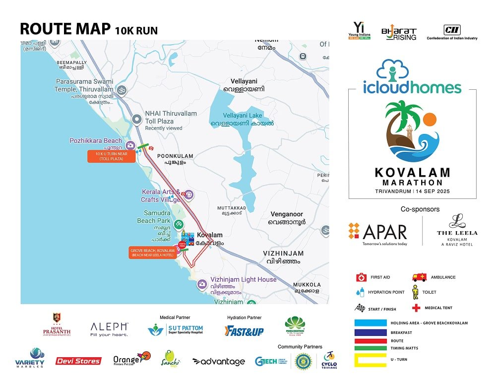 Start and finish point: Grove Beach, Kovalam – near Leela Raviz ‘U TURN’ point: Traffic signal after Thiruvallom bridge Map: The course map will be shared soon.